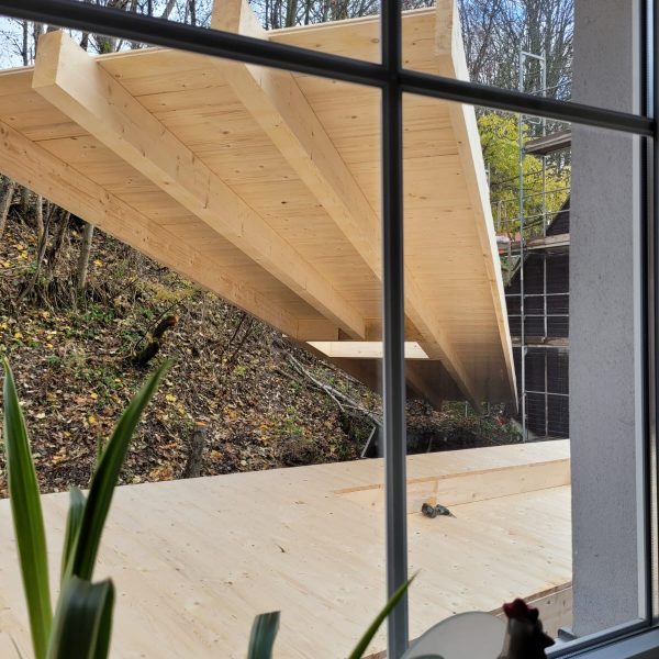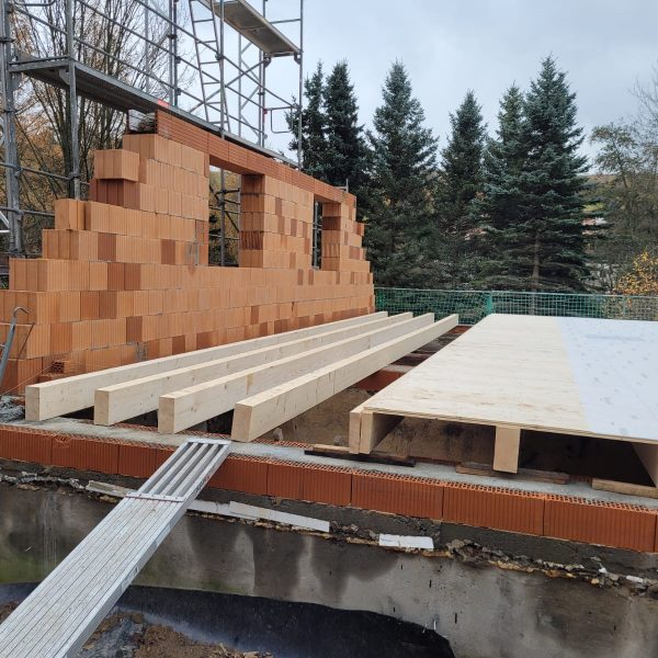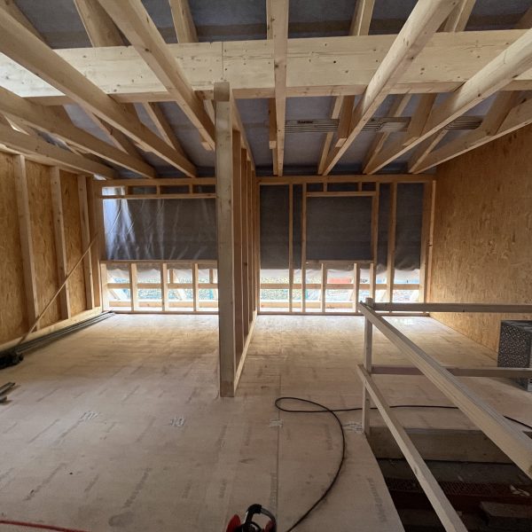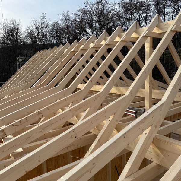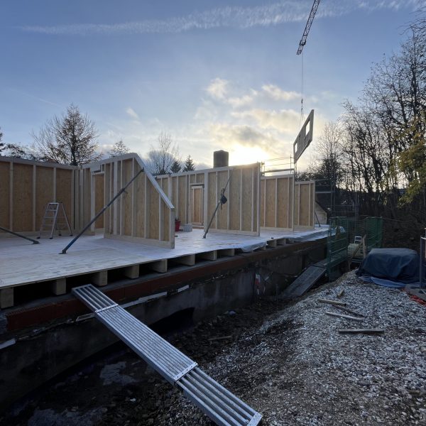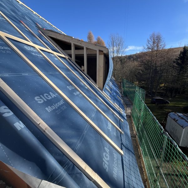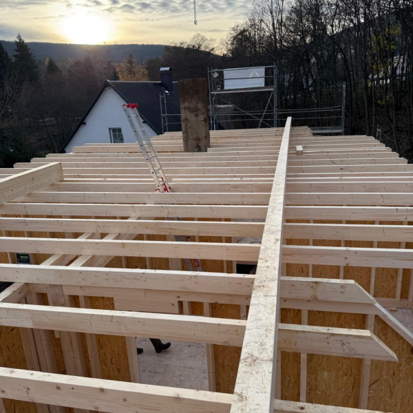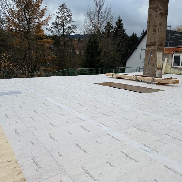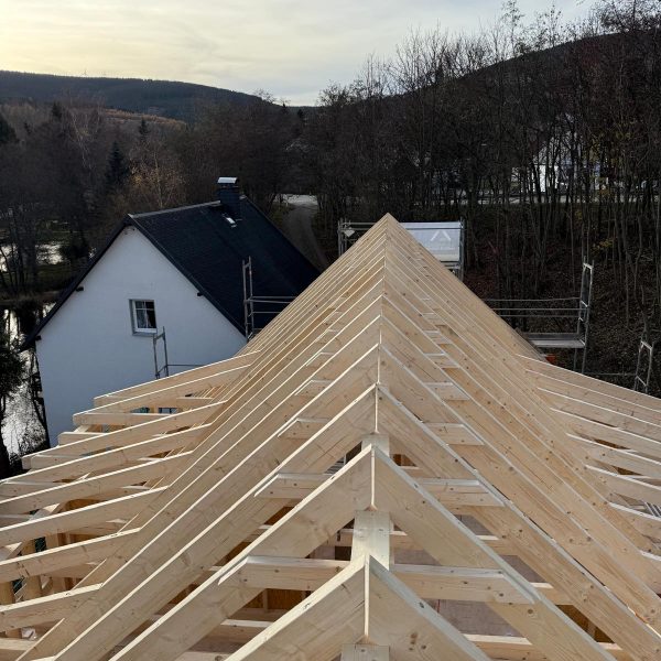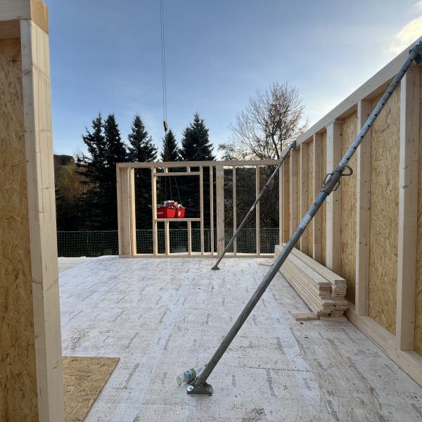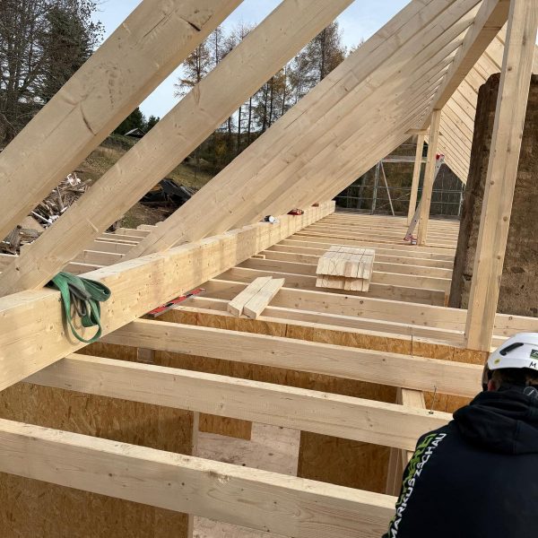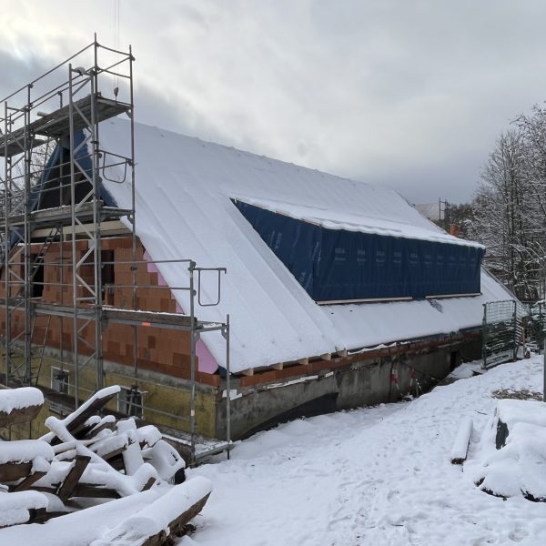Und dann ging alles sehr schnell. Zuerst wurde die oberste Geschossdecke zum Teil vormontiert angeliefert und auf den neuen Ringanker aufgelegt. Anschließend wurden die Holzrahmenbauwände für die Statik des Daches gesetzt und der neue Dachstuhl aufgestellt. Zum Schluss wurde noch eine Unterspannbahn auf den Sparren befestigt und schon stand das neue Dach pünktlich zwei Tage vor dem ersten Schneefall der Wintersaison 2025 / 26.