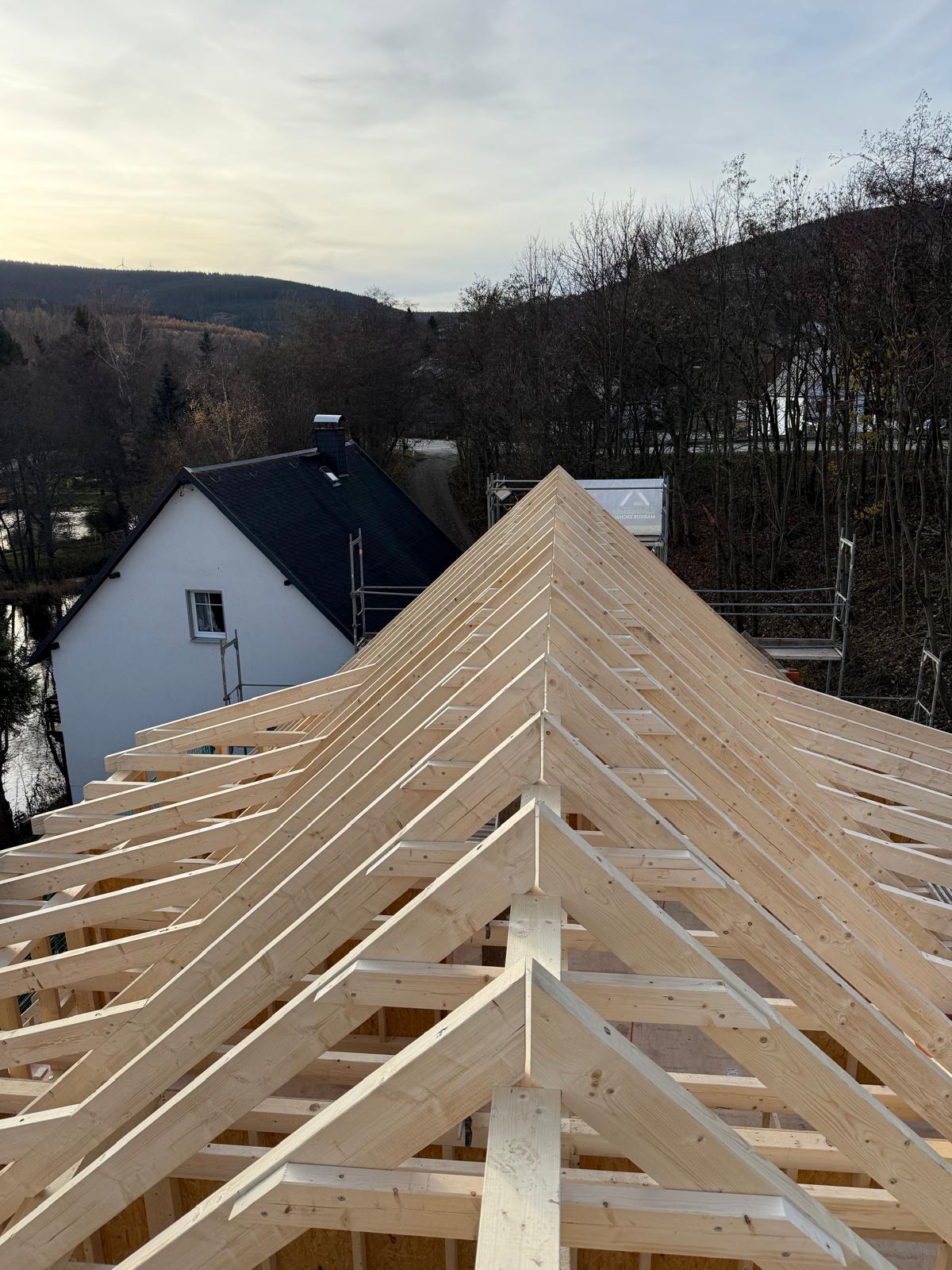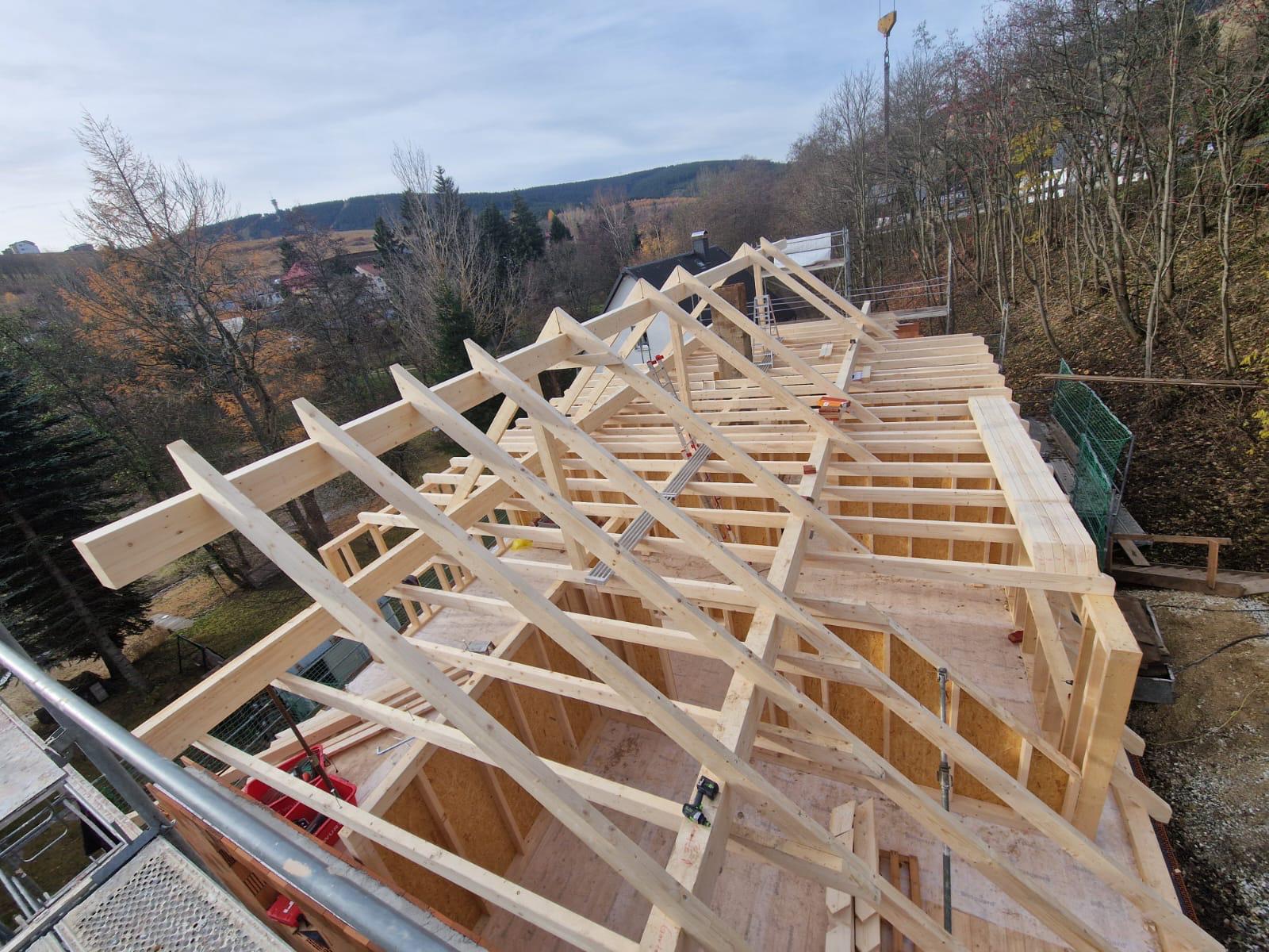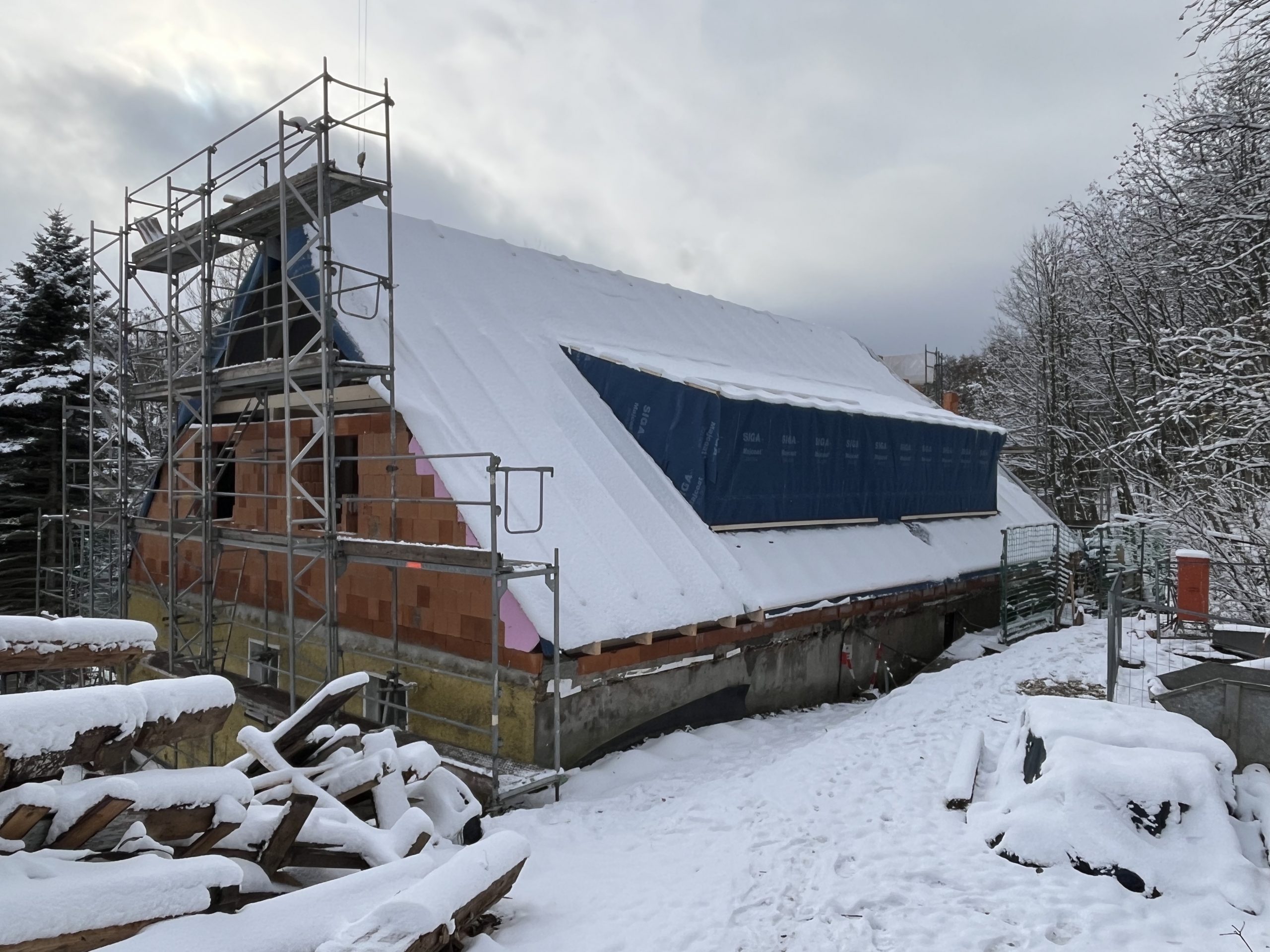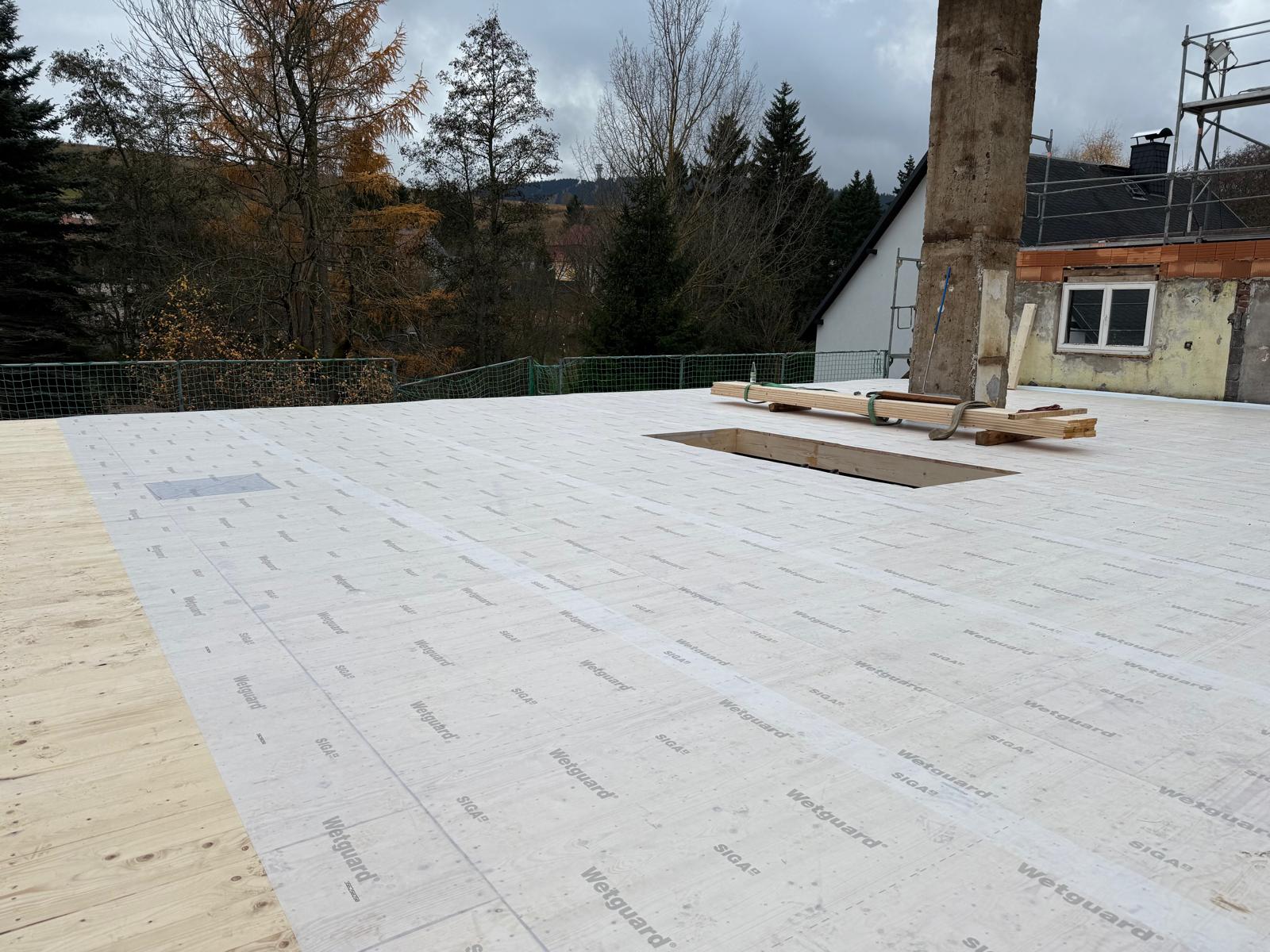 Und dann ging alles sehr schnell. Zuerst wurde die oberste Geschossdecke zum Teil vormontiert angeliefert und auf den neuen Ringanker aufgelegt. Anschließend wurden die Holzrahmenbauwände für die Statik des Daches gesetzt und der neue Dachstuhl aufgestellt. Zum Schluss wurde noch eine Unterspannbahn auf den Sparren befestigt und schon stand das neue Dach pünktlich zwei Tage vor dem ersten Schneefall der Wintersaison 2025 / 26.