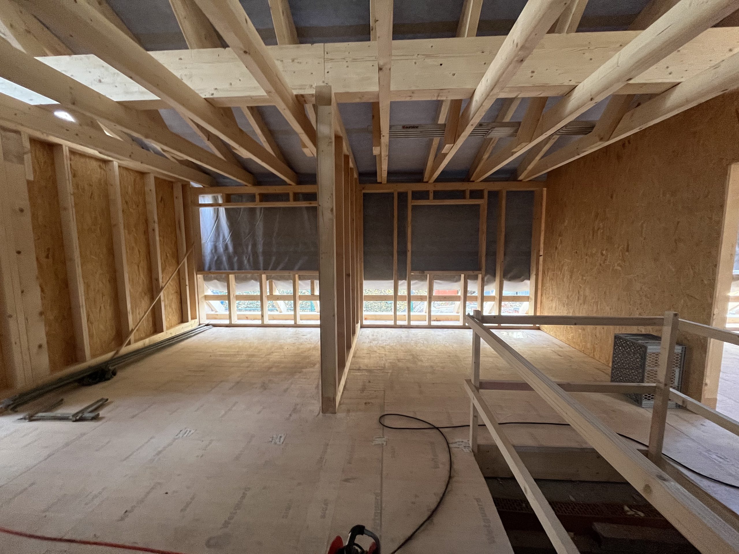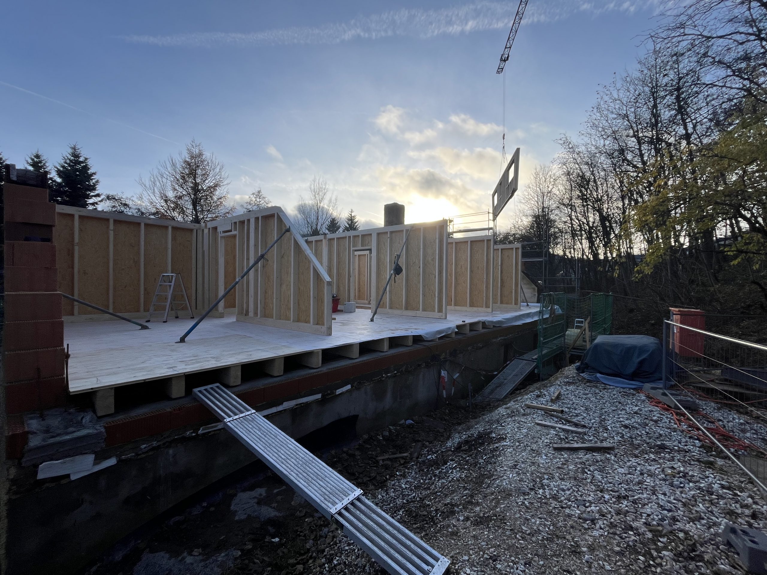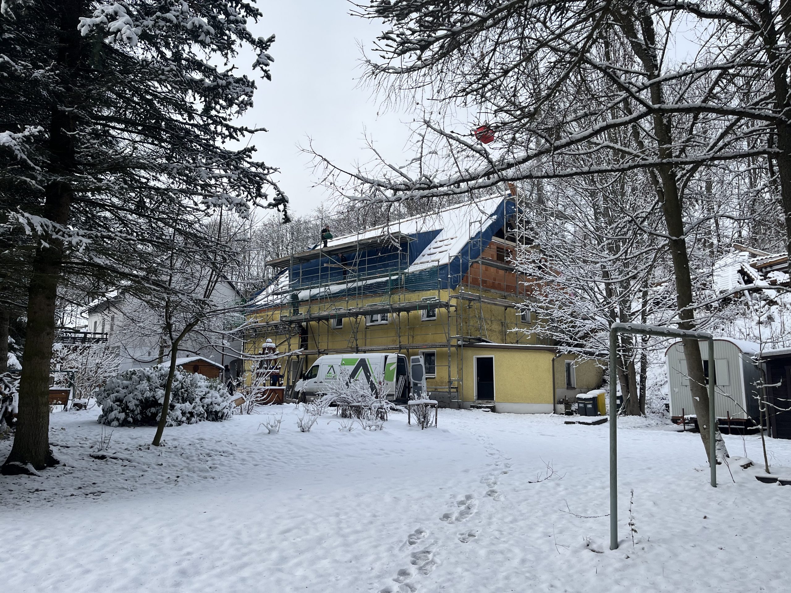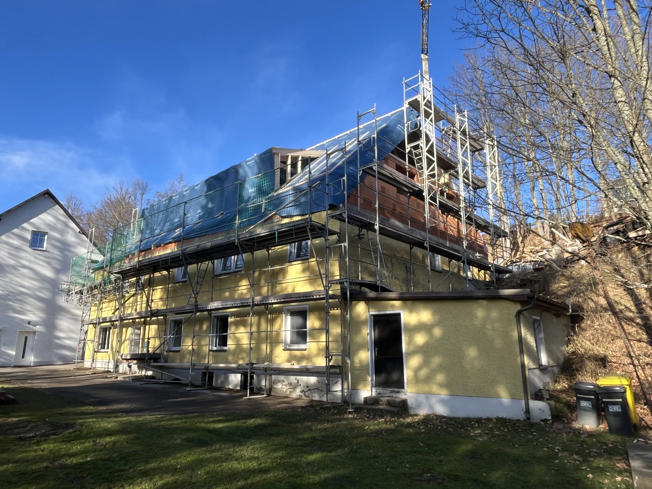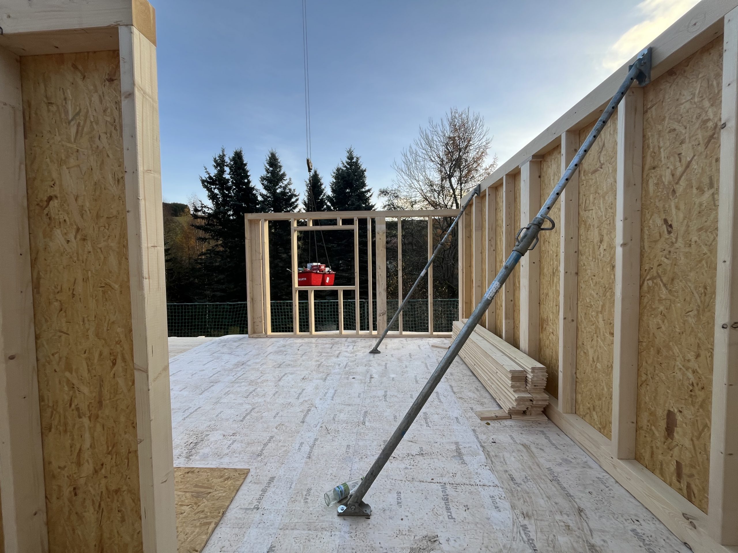 Und dann ging alles sehr schnell. Zuerst wurde die oberste Geschossdecke zum Teil vormontiert angeliefert und auf den neuen Ringanker aufgelegt. Anschließend wurden die Holzrahmenbauwände für die Statik des Daches gesetzt und der neue Dachstuhl aufgestellt. Zum Schluss wurde noch eine Unterspannbahn auf den Sparren befestigt und schon stand das neue Dach pünktlich zwei Tage vor dem ersten Schneefall der Wintersaison 2025 / 26.