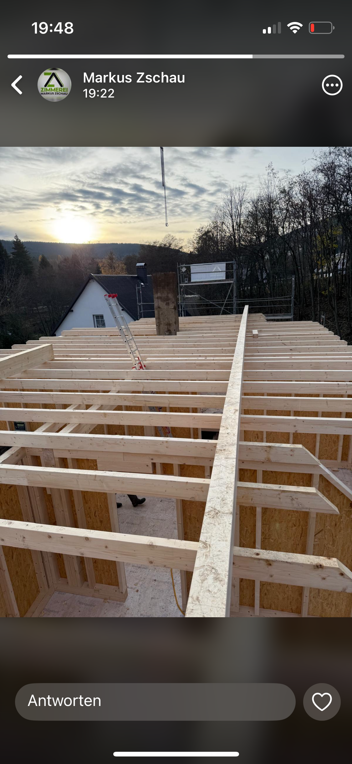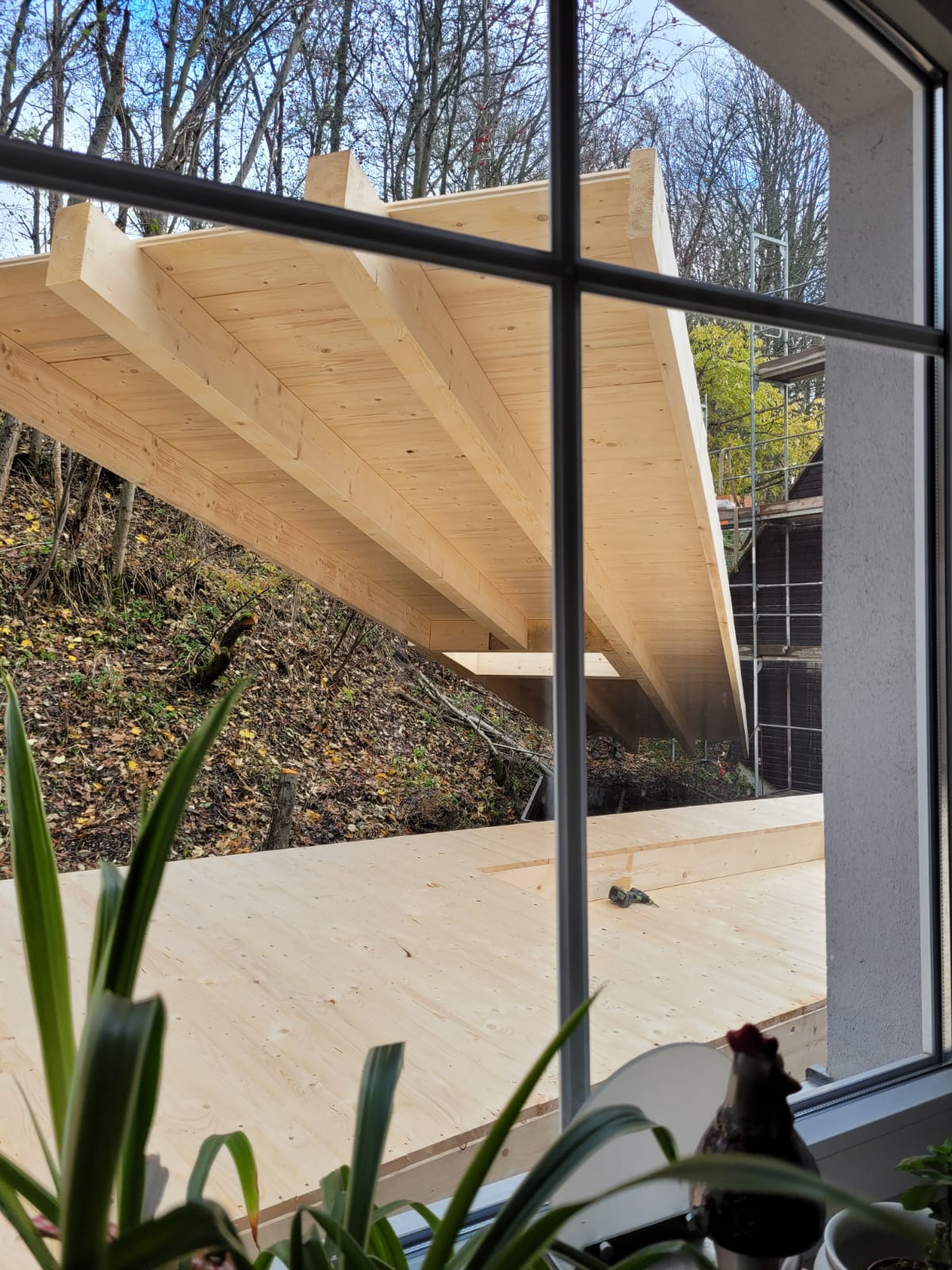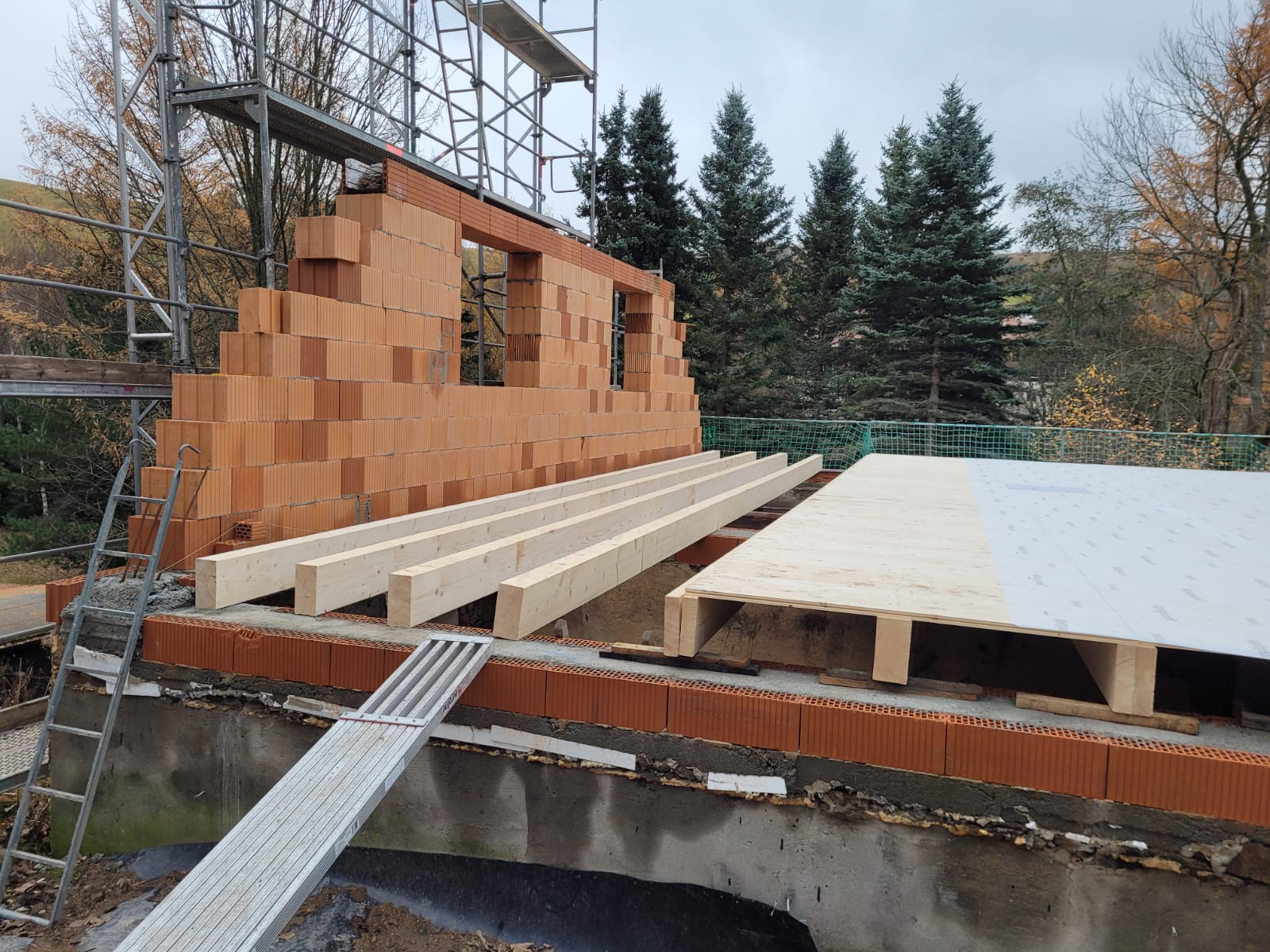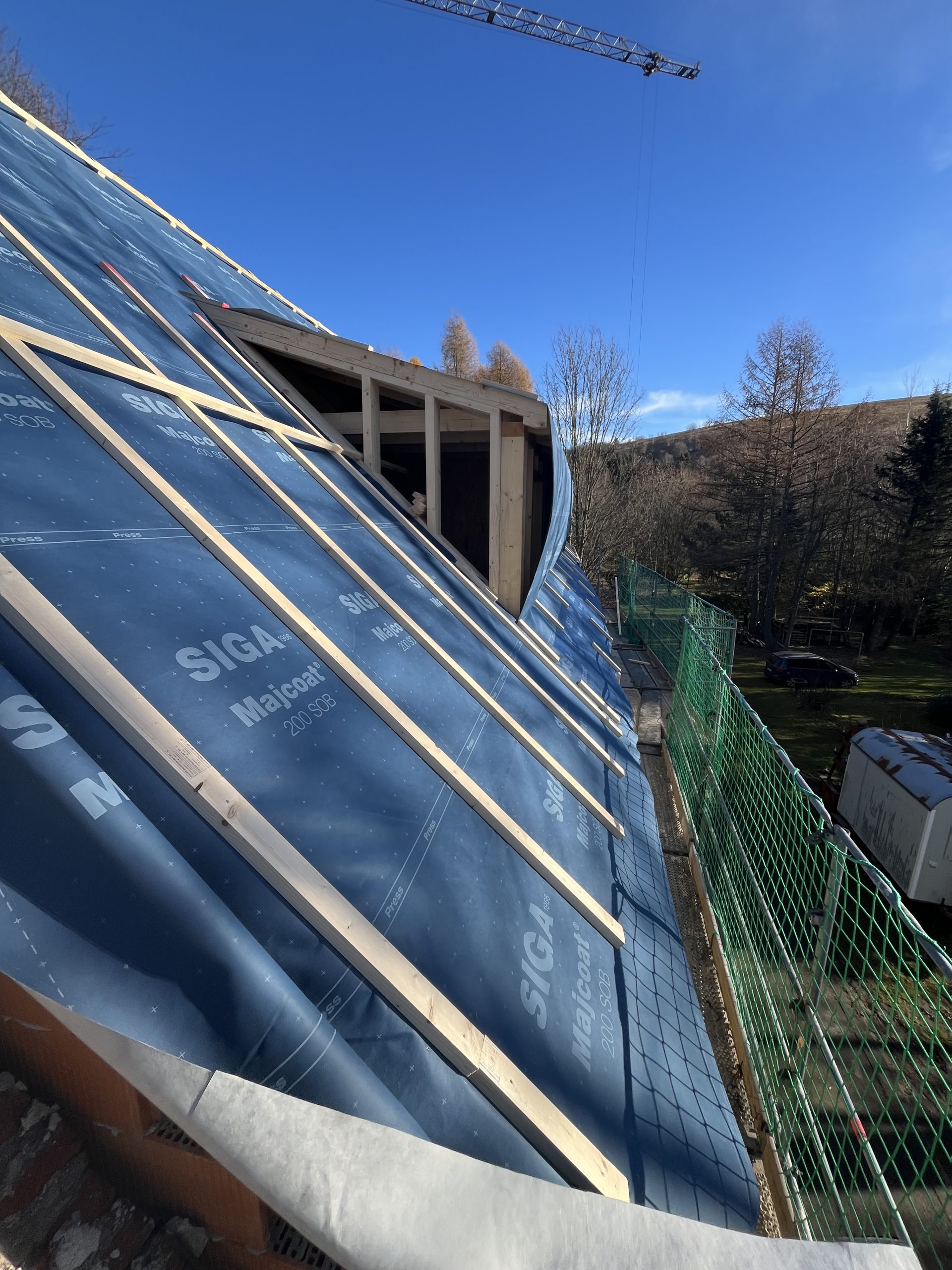 Und dann ging alles sehr schnell. Zuerst wurde die oberste Geschossdecke zum Teil vormontiert angeliefert und auf den neuen Ringanker aufgelegt. Anschließend wurden die Holzrahmenbauwände für die Statik des Daches gesetzt und der neue Dachstuhl aufgestellt. Zum Schluss wurde noch eine Unterspannbahn auf den Sparren befestigt und schon stand das neue Dach pünktlich zwei Tage vor dem ersten Schneefall der Wintersaison 2025 / 26.