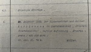 - Juli 1922: Verkauf an Karl Lorenz, Mühlenbesitzer und Bäckermeister mit Frau Theresia für 400.000 Mark